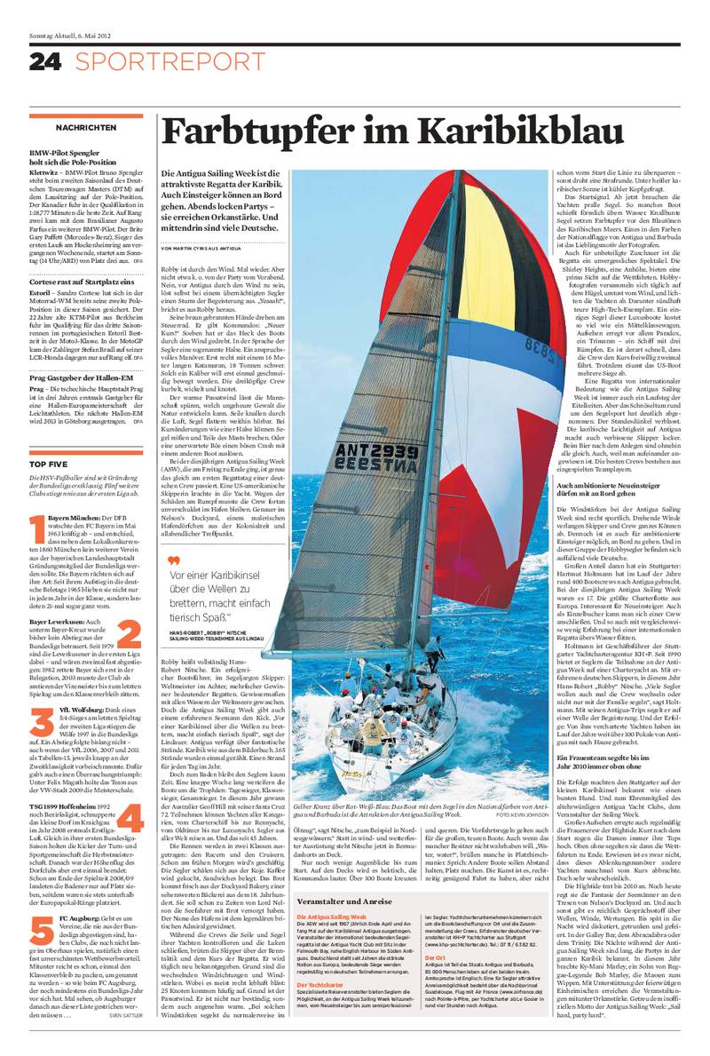 Martin Cyris berichtet in einer der großen Sonntagszeitungen, "Sonntag Aktuell", mit mehr als 800.000 Auflage, über die Antigua Sailing Week. Hier im Anhang der Bericht vom 6.5.2012 als PDF zum Nachlesen.